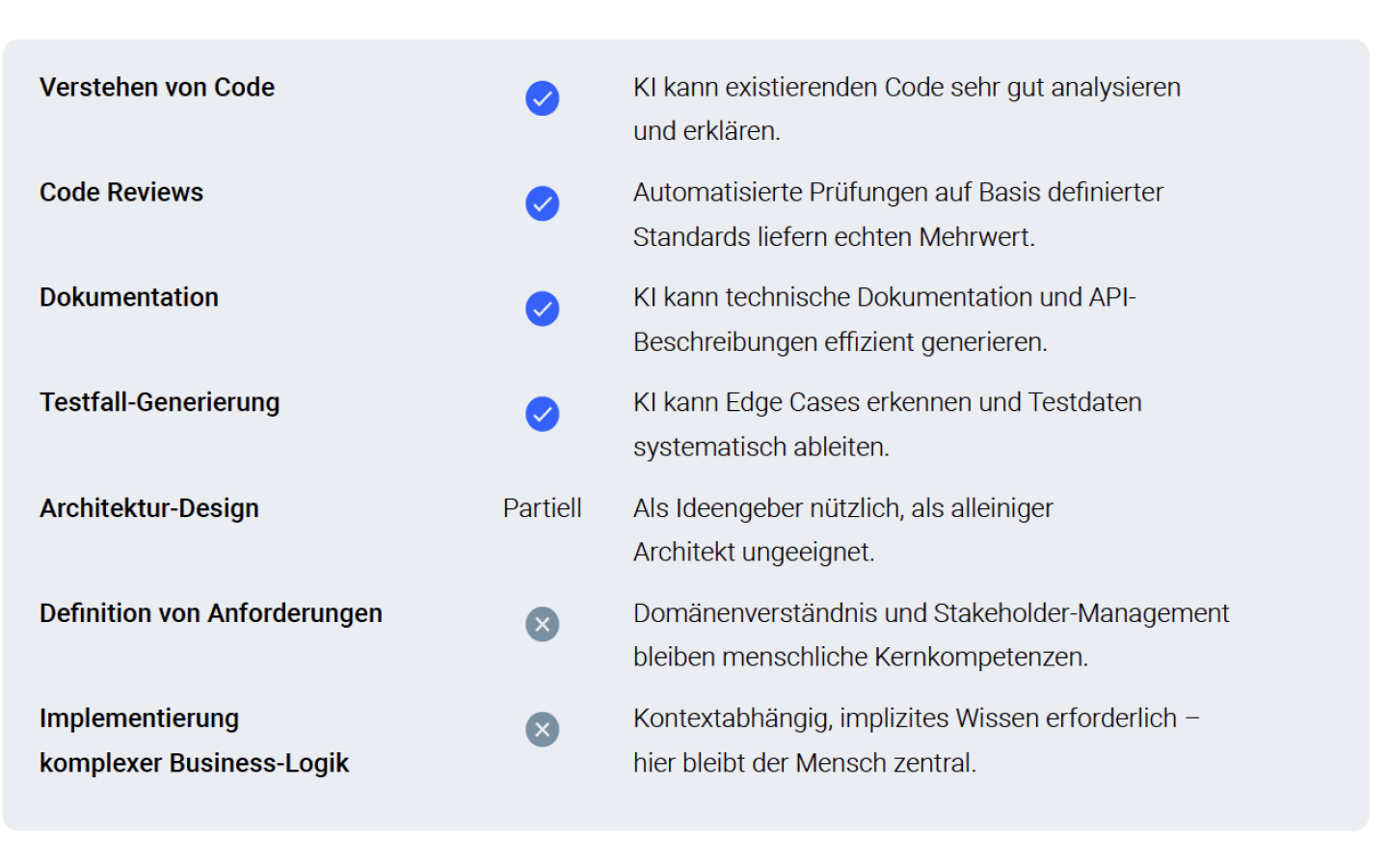 “30 percent faster development”, “50 percent more productivity”, “double the output capacity” – the promises come thick and fast. Studies by tool providers suggest leaps in productivity that are rarely achieved in practice. There are indeed areas in which AI tools enable significant efficiency gains: the generation of boilerplate code, the creation of unit tests, documentation, or refactoring according to known patterns. This is where AI delivers real added value. The problem comes when speed is considered in isolation. Software development is not a sprint, but a marathon. Code that is generated in record time today can become a technical liability tomorrow if it lacks quality. Maintainability, expandability, security, and performance cannot be replaced by speed. Low-quality code churned out at speed becomes a boomerang, and the initial efficiency gains are negated by expensive redrafting. So the goal cannot be to produce more code in less time. The aim is to develop higher quality software with the same resources - more robust, safer, more maintainable. Or vice versa: achieving the same level of quality with less effort. Measurability remains a key challenge. Which KPIs are useful? How can you quantify an increase in efficiency? It often helps to be pragmatic: direct feedback from the development teams, supplemented by objective metrics such as test coverage, the scope of documentation, or the bug rate over time. Something that is often underestimated is that the adoption curve is flat. Developers need time to integrate AI tools into their workflow effectively. In the enterprise environment, it realistically takes six to twelve months before measurable efficiency gains can be seen. This ramp-up phase must be factored in.
