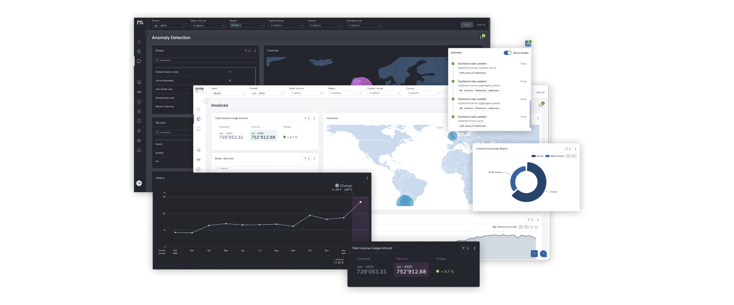 MINT Digital Services, a subsidiary of SUISA, represents musicians and publishers worldwide in their dealings with streaming platforms such as Spotify and Apple Music. Month after month, these platforms deliver billions of individual data points that form the basis for royalty statements. However, the previous systems were reaching their limits. Dashboards were slow and inefficient, business logic was fragmented, and collaboration was time­consuming and only possible via data exports. SUISA needed a technically powerful platform that would guarantee business users direct and user­friendly access to the data. Open Datastack not only collects and processes data, but also makes it directly usable in daily decision­making processes. Specialist departments carry out self­service analyses, work collaboratively on dashboards, and use interactive workflows to translate findings directly into action. At the same time, the platform is designed to be future­proof. It can be operated flexibly, integrates an MCP server for future AI applications, and works independently of proprietary providers.