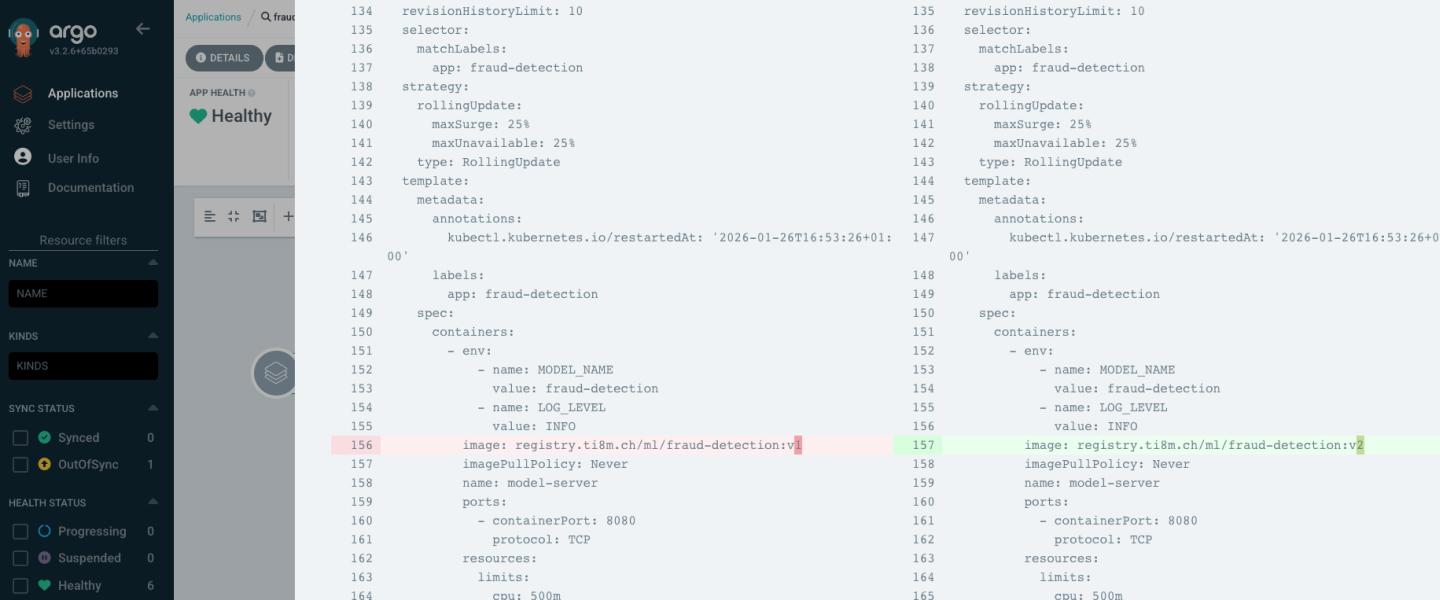 Der Data Scientist (oder die Pipeline) aktualisiert nicht den Cluster direkt. Stattdessen wird ein Commit im gitops-repo gemacht. Das ist unser Audit Trail. Wir können Jahre später noch sagen: «Am 14. Januar 2026 um 14:03 Uhr wurde Modell V2 ausgerollt.»