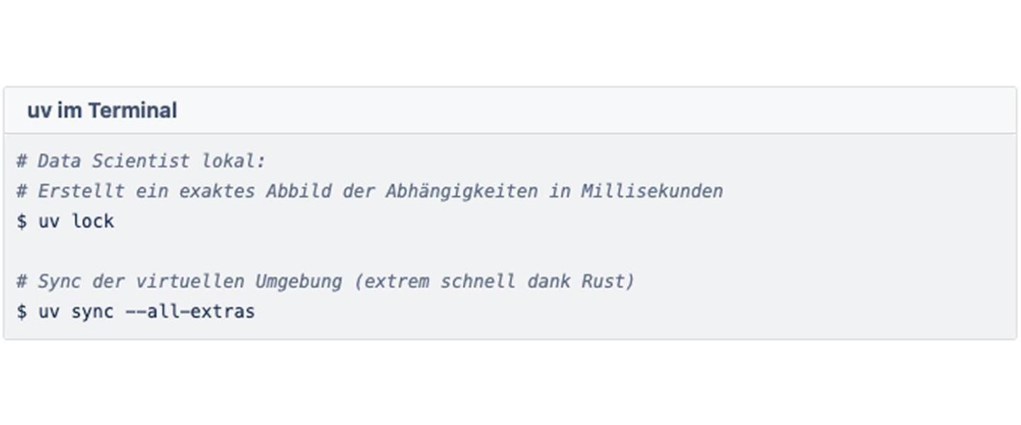Geschwindigkeit ist kein Luxus, sondern Voraussetzung für Developer Experience. Mit uv eliminieren wir die Wartezeiten im Loop