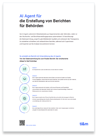 Der AI Agent unterstützt Mitarbeitende aus Departementen oder Behörden, indem er den Recherche- und Berichtserstellungsprozess automatisiert. Er beschleunigt die Datensammlung, sorgt für gleichbleibende Qualität und verbessert die Transparenz. So entstehen schnellere und verlässlichere Berichte, während sich Expertinnen und Experten auf die Analyse konzentrieren können.