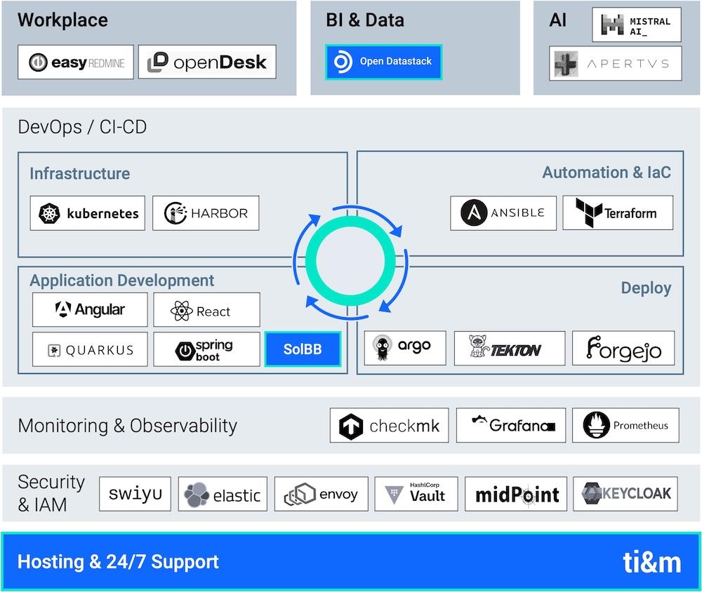 With the ti&m Open Source Stack, we are helping businesses gradually move away from proprietary technologies, or at least establish alternatives. The stack includes selected open-source components from leading providers, secure operation in our Swiss private cloud, and hybrid or on-prem 24/7 support. Continuous enhancements in policy-as-code, MLOps, and FinOps enable our customers to remain technologically future-proof and economically transparent. All components are license-free, auditable, and openly visible. Active further development by the open-source community ensures a high speed of innovation, while ti&m takes care of maintenance, updates, and quality assurance. We provide support for the entire operation, from faults and software bugs to complex queries. Our comprehensive monitoring tools detect problems proactively, and our service desk acts as a central point of contact. Tiered service level agreements (SLAs), DevOps infrastructure, and software management ensure stable, secure, and scalable operation. They also cover the entire application lifecycle management process.